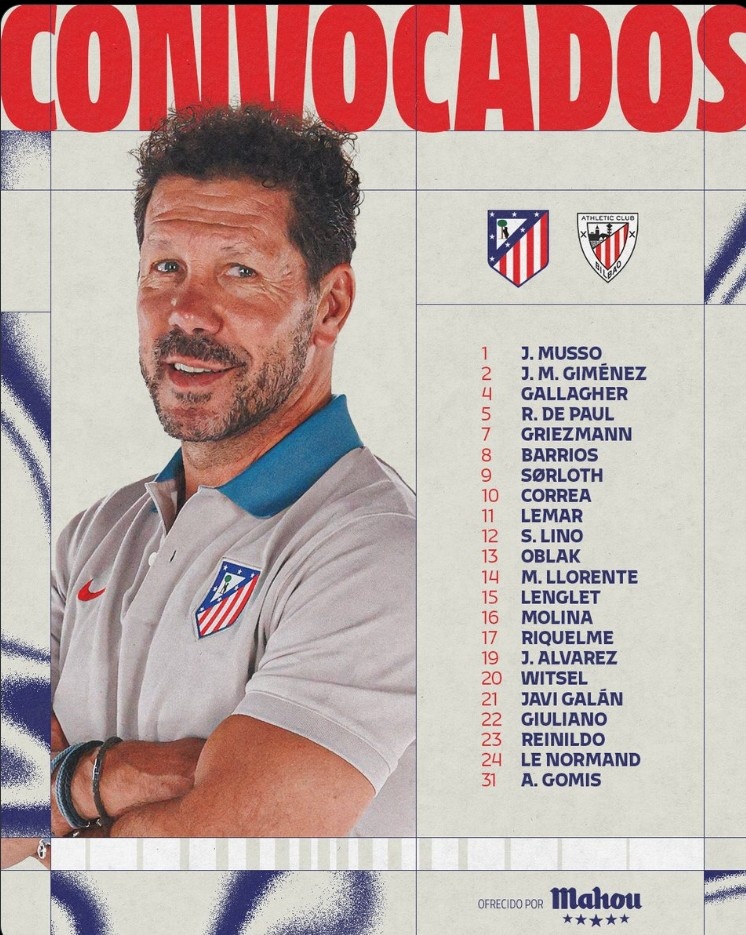 前鋒:格列茲曼、索爾洛特、安赫爾-科雷亞、阿爾瓦雷斯、朱利亞諾-西蒙尼