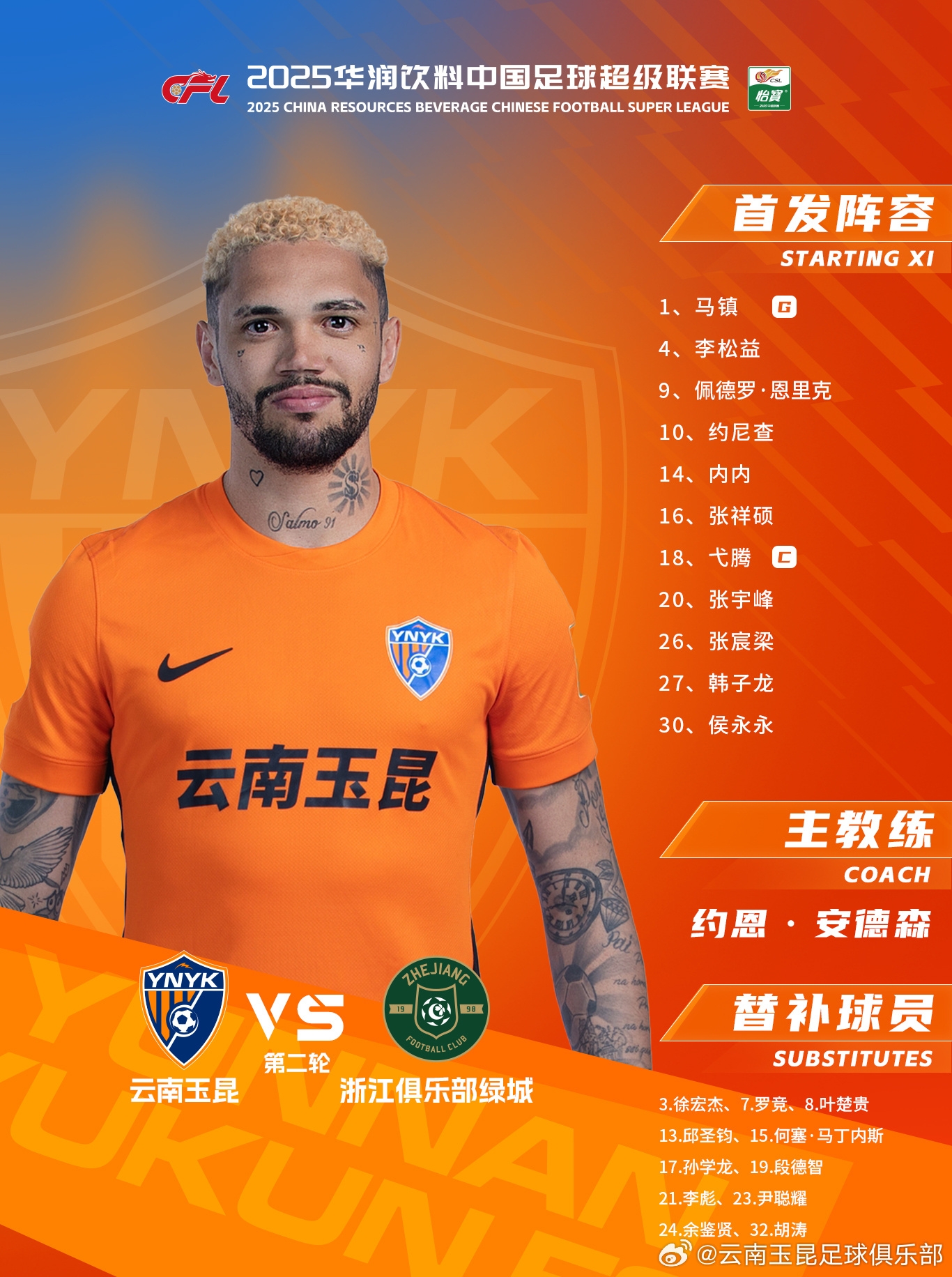 云南玉昆vs浙江俱樂部綠城 本場比賽名單出爐,恩里克與張宇峰迎來加盟后第一次首發(fā),弋騰復出帶上隊長袖標