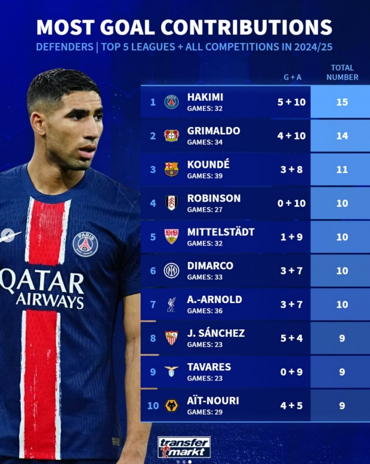 3月1日訊 德轉(zhuǎn)盤點了本賽季五大聯(lián)賽后衛(wèi)球員在各項賽事中參與進(jìn)球榜,其中阿什拉夫居首,孔德、阿諾德等在列,具體榜單如下: