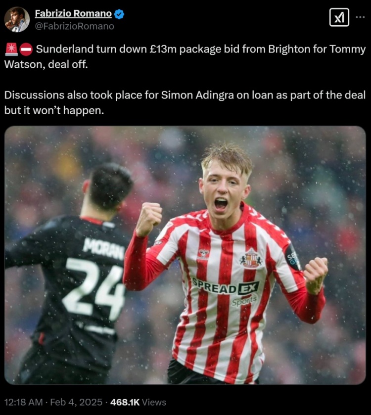 2月4日訊 名記羅馬諾消息,布萊頓開出總價(jià)1300萬(wàn)英鎊的報(bào)價(jià)(含獎(jiǎng)金),求購(gòu)18歲前鋒沃特森,遭到了桑德蘭的拒絕。