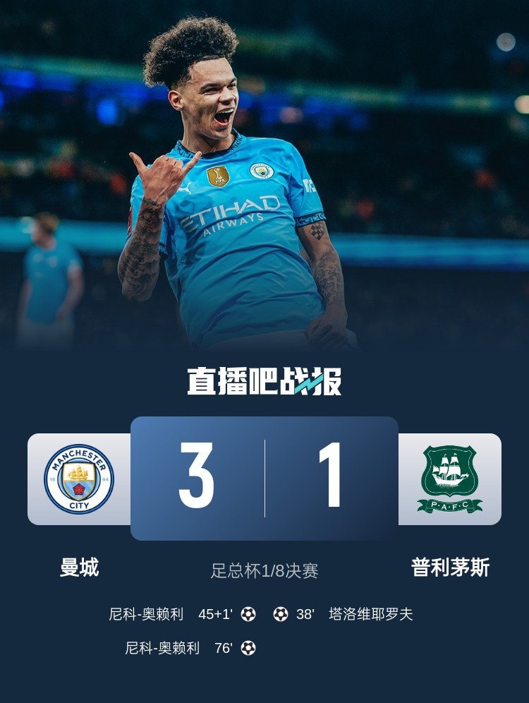 曼城足總杯3-1擊敗普利茅斯,奧賴(lài)?yán)p響建功,丁丁傳射。
