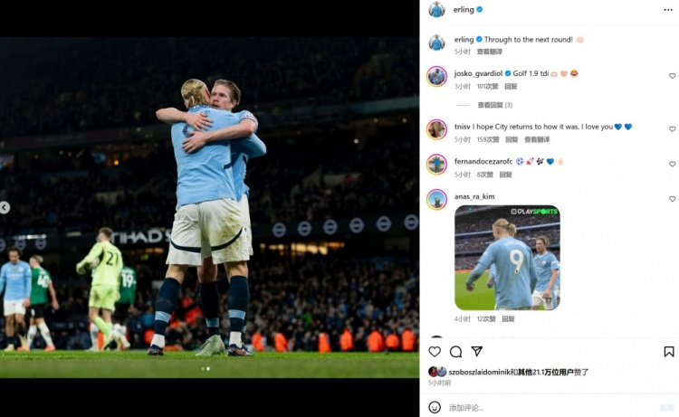 本場比賽哈蘭德助攻德布勞內(nèi)破門,賽后哈蘭德也在個(gè)人社媒曬出與德布勞內(nèi)相擁慶祝的照片,配文寫道:“晉級(jí)足總杯 下一輪!”