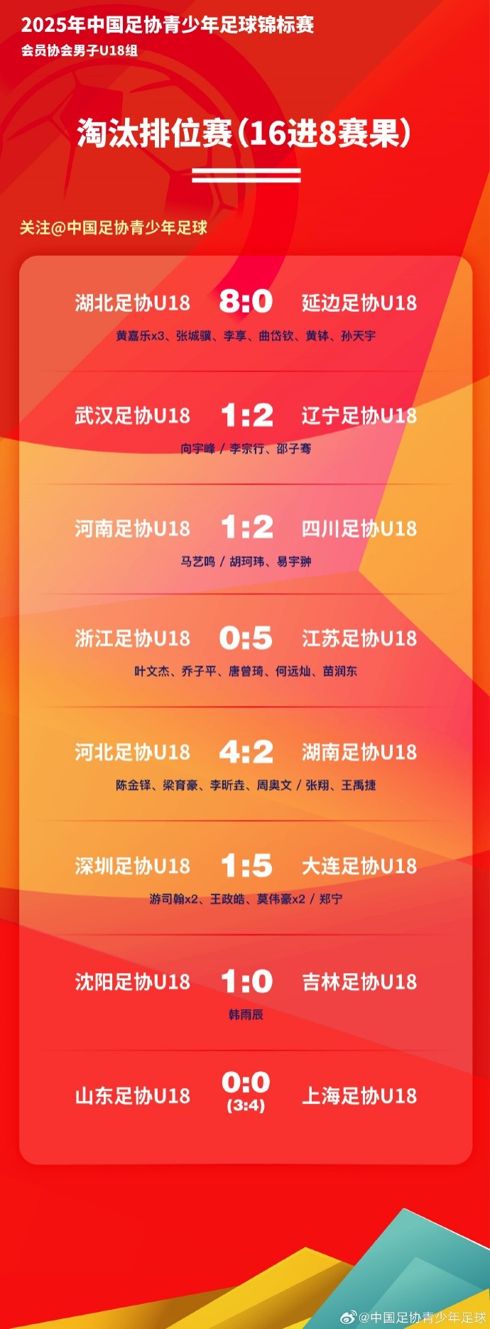 2025年中國足協(xié)青少年足球錦標(biāo)賽會員協(xié)會男子U18組 淘汰排位賽階段(16進8)戰(zhàn)報 +8強對陣???