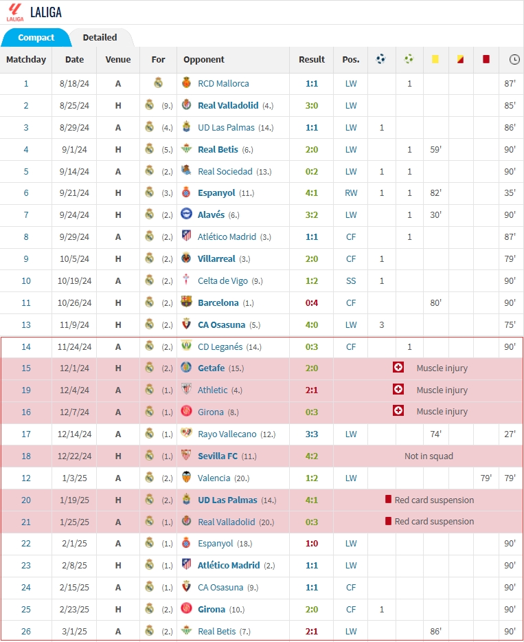 自去年11月底以來(lái),3個(gè)月的時(shí)間里維尼修斯在西甲只取得了1個(gè)進(jìn)球,另有1次助攻,同期卻拿到1紅2黃,傷缺錯(cuò)過(guò)三場(chǎng),停賽錯(cuò)過(guò)兩場(chǎng)。