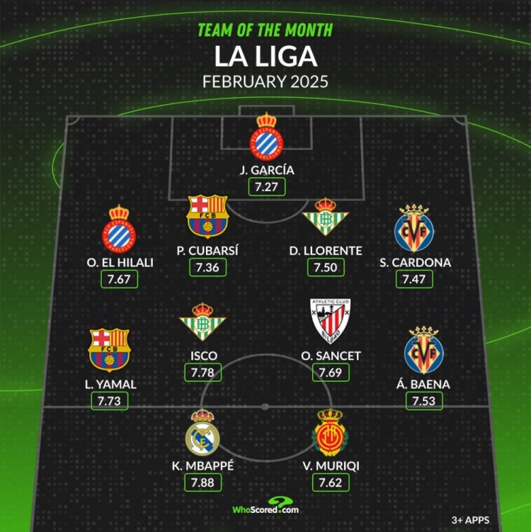 3月2日訊 西甲2月比賽已經全部完賽,whoscored也統(tǒng)計了2月西甲球員評分最佳陣容,姆巴佩、亞馬爾領銜。
