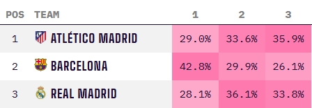 皇馬最新西甲奪冠概率28.1%,西甲三強中最低