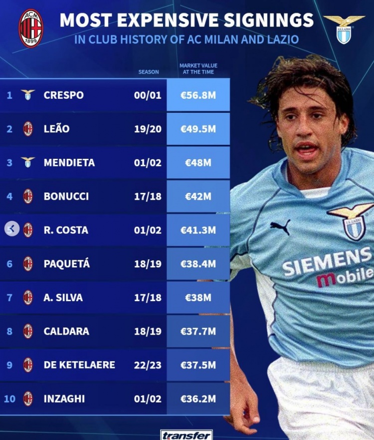 德轉(zhuǎn)列米蘭&拉齊奧歷史轉(zhuǎn)會(huì)費(fèi)最貴榜:歐元