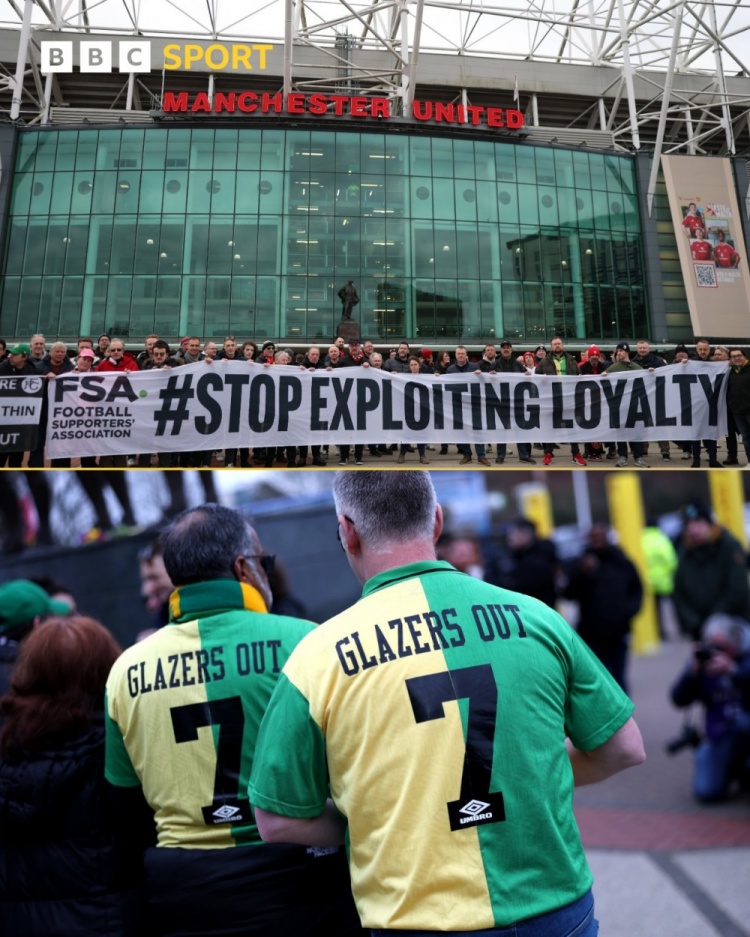 比賽開始前,兩隊(duì)球迷在老特拉福德球場(chǎng)前進(jìn)行了聯(lián)合抗議活動(dòng),拉出了寫有“停止剝削忠誠(chéng)”的橫幅。此外,也有部分曼聯(lián)球迷仍在堅(jiān)持表達(dá)對(duì)格雷澤家族的不滿,他們穿上了印有“格雷澤滾蛋”的球衣。