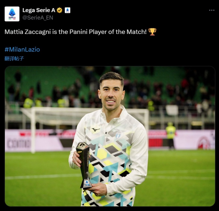 3月3日訊 拉齊奧在本輪意甲焦點(diǎn)戰(zhàn)客場2-1絕殺米蘭,扎卡尼在賽后被意甲官方評選為本場最佳球員。