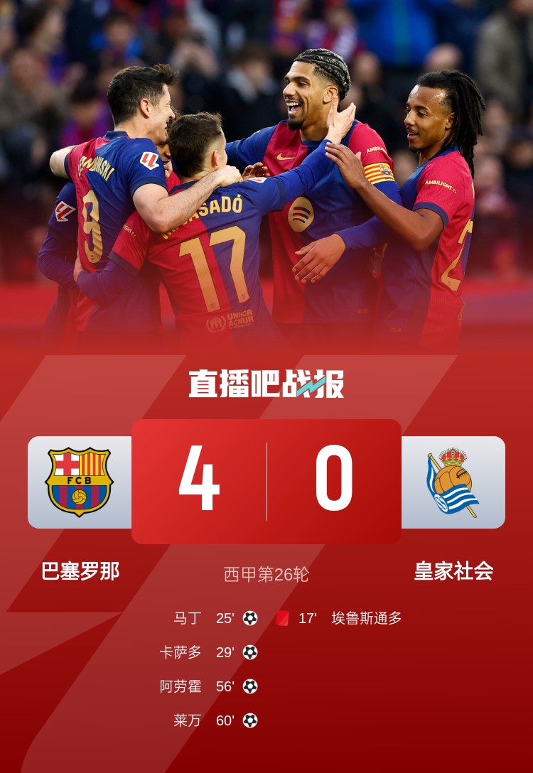 西甲第26輪,巴薩4-0橫掃十人皇家社會,阿勞霍傳射,萊萬進(jìn)球。