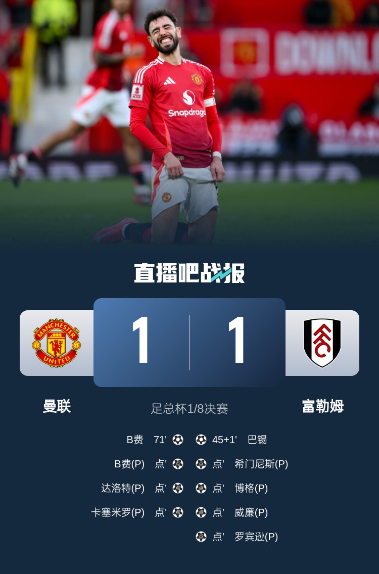 足總杯1/8決賽,曼聯(lián)1-1,點(diǎn)球大戰(zhàn)3-4不敵富勒姆,止步16強(qiáng),林德洛夫、齊爾克澤失點(diǎn)。