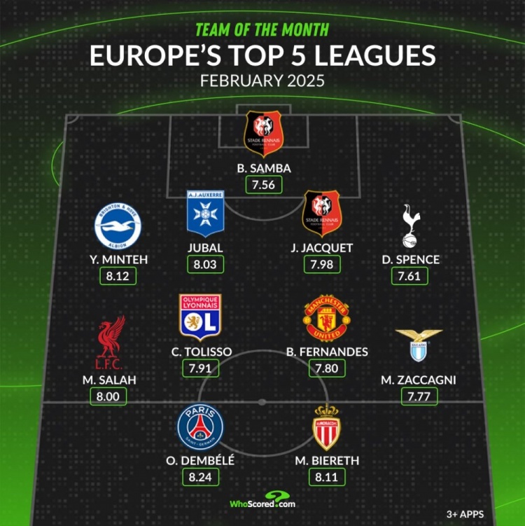 3月3日訊 whoscored統(tǒng)計(jì)了五大聯(lián)賽2月評(píng)分最佳陣容,登貝萊、薩拉赫、B費(fèi)領(lǐng)銜。