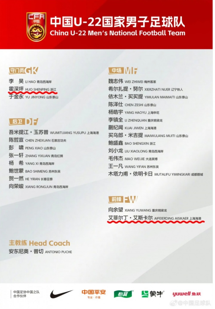 3月3日,中國足協(xié)公布U22國足2025年第一期集訓(xùn)名單,恒大足校培養(yǎng)球員霍深坪、艾菲爾丁入選。為備戰(zhàn)2026年U23亞洲杯及名古屋亞運(yùn)會,隊(duì)伍定于2025年3月5日至26日赴江蘇省蘇州市、鹽城市組織集訓(xùn)并參加國際足球邀請賽。