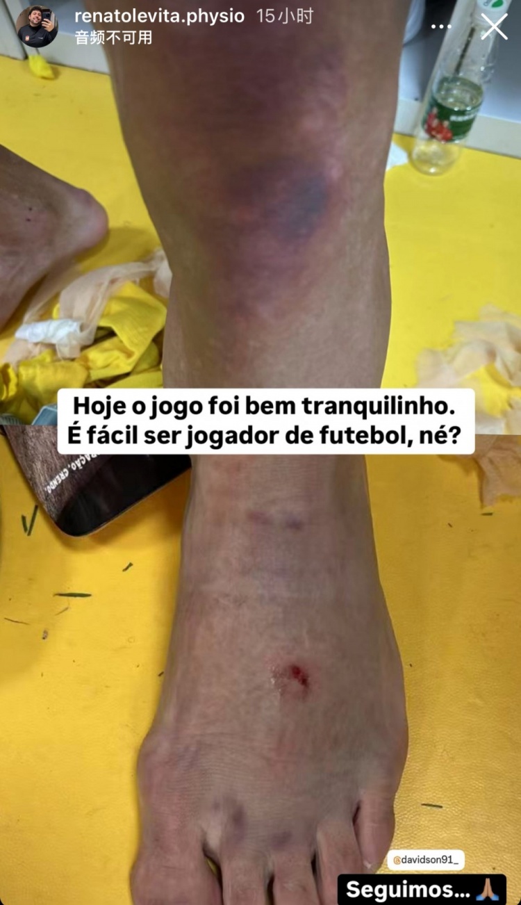 本場比賽戴維森打滿全場,作為西海岸核心球員的他,自然也得到了三鎮(zhèn)隊的重點“關照”。從西海岸理療師社媒曬出的照片可以看到,一場比賽下來,戴維森的腿部已是傷痕累累,西海岸理療師為此配文寫道:“一場平靜的比賽。當足球運動員很容易,對吧?”