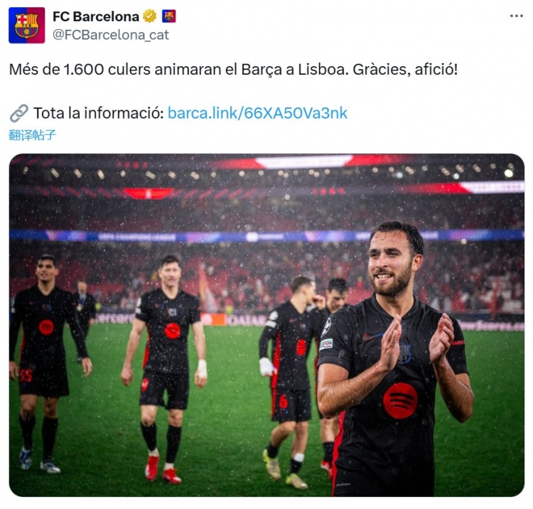 賽前,巴薩官方在社交媒體發(fā)文,感謝了隨隊遠(yuǎn)征客場的球迷們。巴薩在其官方社交媒體上這樣寫道:“超過1600名巴薩球迷將在里斯本為巴薩加油助威,感謝球迷們!”