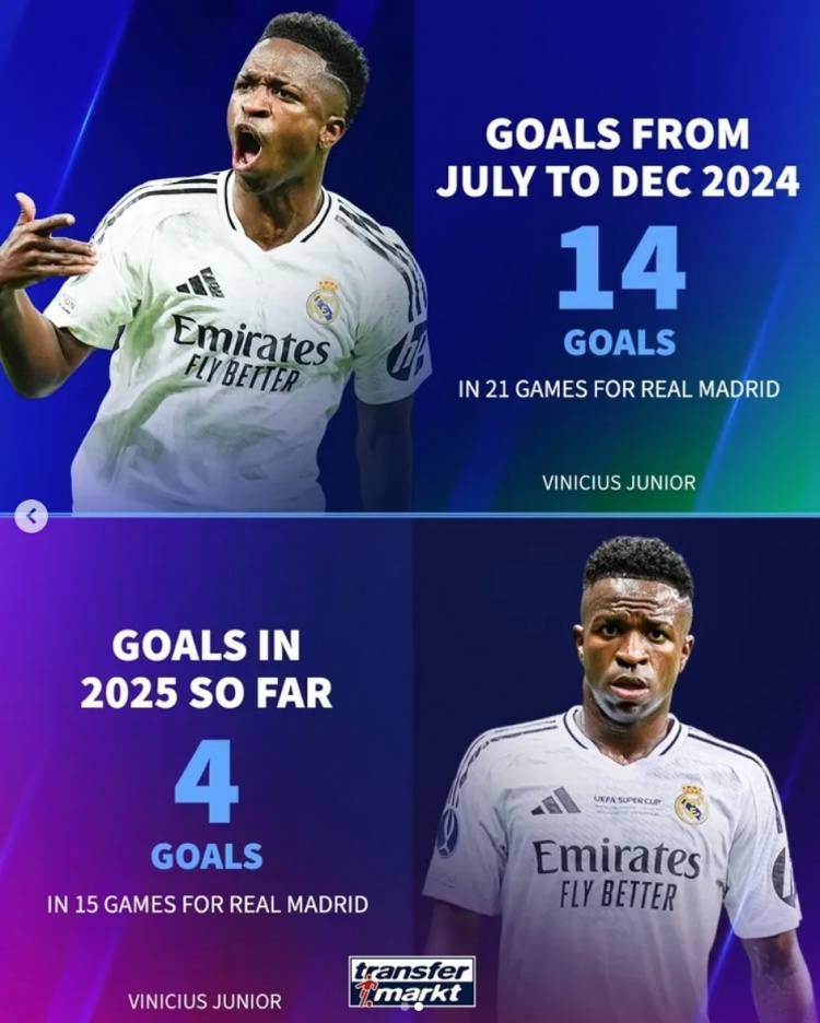 數(shù)據(jù)統(tǒng)計(jì)顯示,維尼修斯在本賽季上半程(7月至12月)21場打進(jìn)14球,而進(jìn)入2025年后15場僅4球入賬。