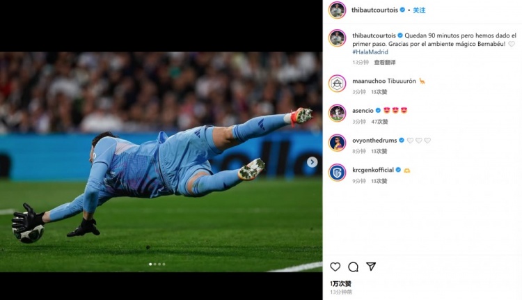 庫爾圖瓦曬出自己的撲救照,并配文:“還剩90分鐘,但我們已經(jīng)邁出了第一步。感謝球迷們在伯納烏營造的神奇氛圍!”
