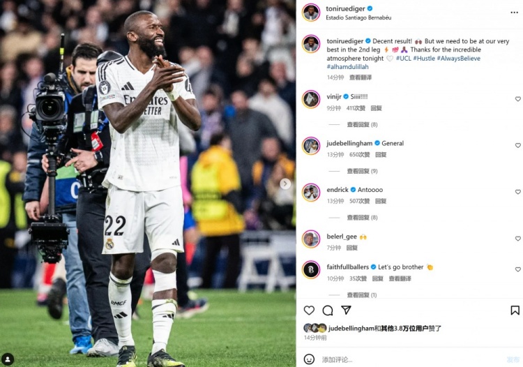 3月5日訊 在本輪歐冠,皇馬2-1擊敗馬競。賽后呂迪格也在個(gè)人社媒曬出本場照片,配文寫道:“不錯(cuò)的結(jié)果,但是下一回合我們要拿出自己最佳的狀態(tài),感謝球迷們今夜難以置信的支持!” 標(biāo)簽: 足球 西甲 皇家馬德里