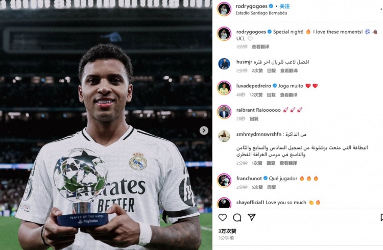 羅德里戈在賽后被歐冠官方評為本場最佳球員,他也通過社媒曬出自己手捧獎(jiǎng)杯的照片,并配文:“特別的夜晚!我愛這樣的時(shí)刻!??????????歐冠”