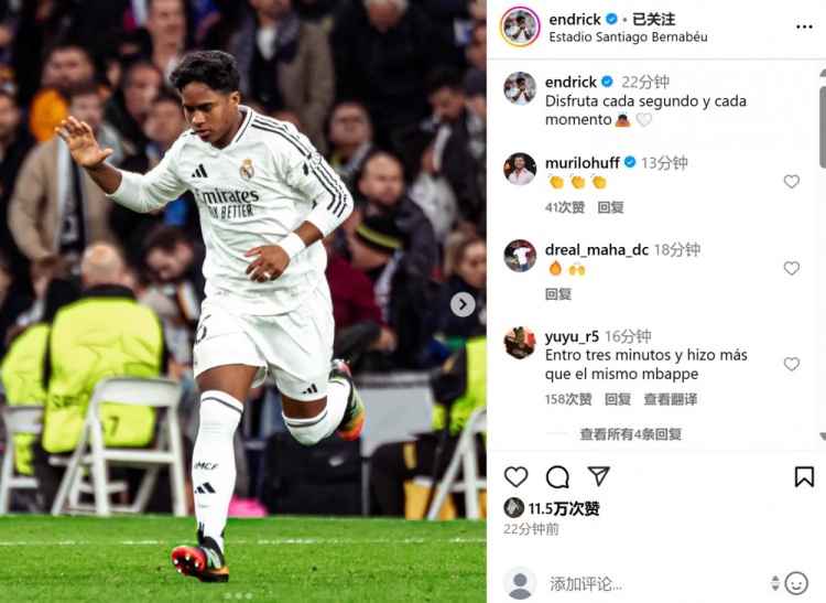 3月5日訊 在本輪歐冠,皇馬2-1擊敗馬競。本場比賽恩德里克在最后時刻替補登場,迎來個人歐冠淘汰賽首秀。賽后他也在個人社媒曬出本場照片,配文寫道:“享受比賽的每一個瞬間!” 標簽: 足球 西甲 皇家馬德里