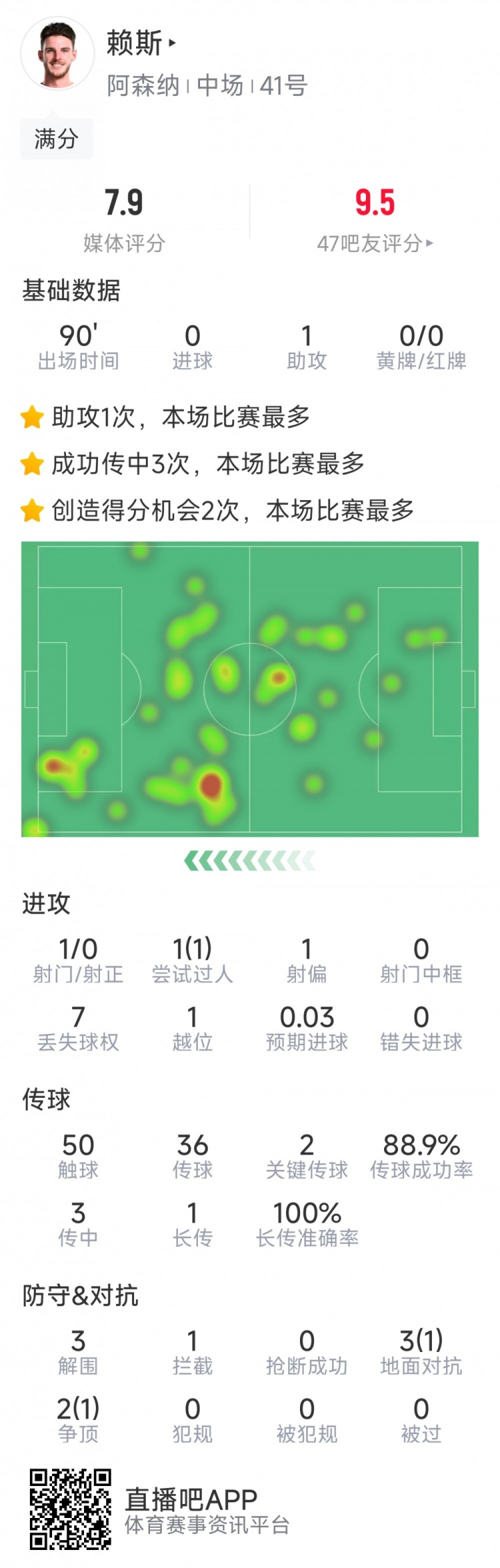 3月5日訊 在本輪歐冠阿森納7-1大勝埃因霍溫的比賽中,賴斯發(fā)揮出色,以下為他在本場數(shù)據(jù):