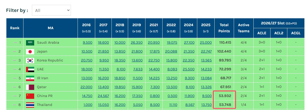 這也意味著中國參加26/27賽季的亞足聯(lián)賽事名額從2+1+1降為1+1+1(一支直通亞冠精英正賽+1個亞冠精英附加賽+1支直通亞冠二級聯(lián)賽正賽)。