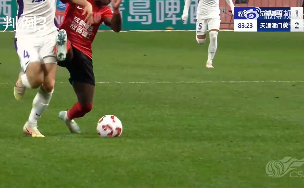 【判例三】:中超聯(lián)賽第2輪,成都蓉城VS天津津門虎,比賽第84分鐘,天津津門虎4號隊員在爭搶球時疑似踩踏成都蓉城47號隊員,裁判員判罰天津津門虎4號犯規(guī),未出示紅黃牌,VAR未介入。