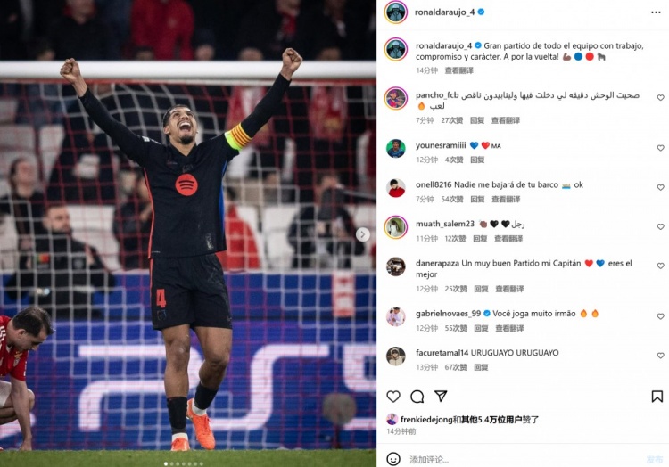 隊(duì)長(zhǎng)阿勞霍也在個(gè)人社媒曬出仰天長(zhǎng)嘯慶祝照,配文寫(xiě)道:“全隊(duì)?wèi){借努力、決心以及意志踢出一場(chǎng)精彩的比賽,讓我們下一回合再來(lái)!”