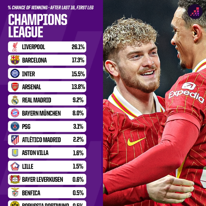 此外,Opta還計算了各支球隊晉級歐冠四強、決賽以及歐冠奪冠的概率。