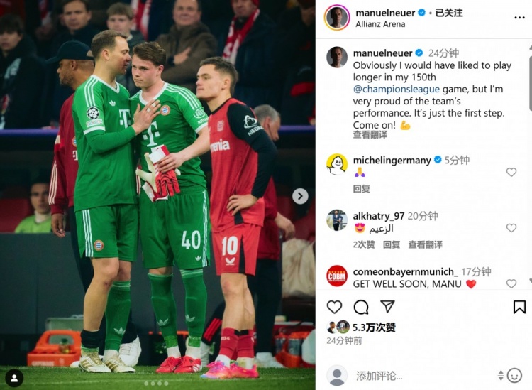 本場(chǎng)比賽是諾伊爾生涯第150次歐冠出場(chǎng),不過他在比賽中因傷被換下。賽后他在個(gè)人社媒曬出被烏爾比希換下照片,配文道:“顯然我希望在自己第150場(chǎng)歐冠踢更長(zhǎng)時(shí)間,但是我為球隊(duì)的表現(xiàn)感到驕傲,這只是晉級(jí)的第一步,加油!”
