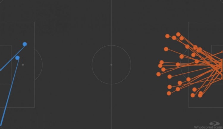 在whoscored統(tǒng)計的射門圖上,利物浦唯一的射正就進(jìn)球了,另一腳踢向了角旗;巴黎的射門則是密密麻麻……