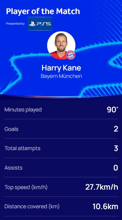 本場(chǎng)比賽凱恩梅開(kāi)二度,3次射門(mén),跑動(dòng)距離10.6km,賽后他也當(dāng)選歐冠官方評(píng)選的本場(chǎng)最佳球員。