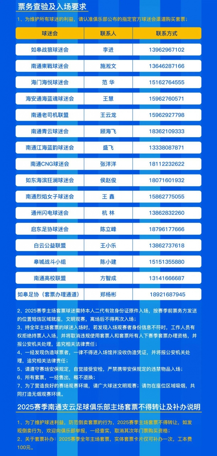 ?五、2025賽季南通支云足球俱樂部主場套票不得轉(zhuǎn)讓及補辦說明: