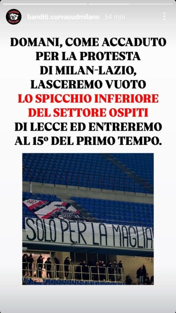 米蘭南看臺球迷組織在社交平臺上宣布:“明天,就像米蘭-拉齊奧時(shí)發(fā)生的抗議一樣,我們將會在萊切球場客隊(duì)坐區(qū)制造一片空場,我們將會從上半場第15分鐘再進(jìn)場。”
