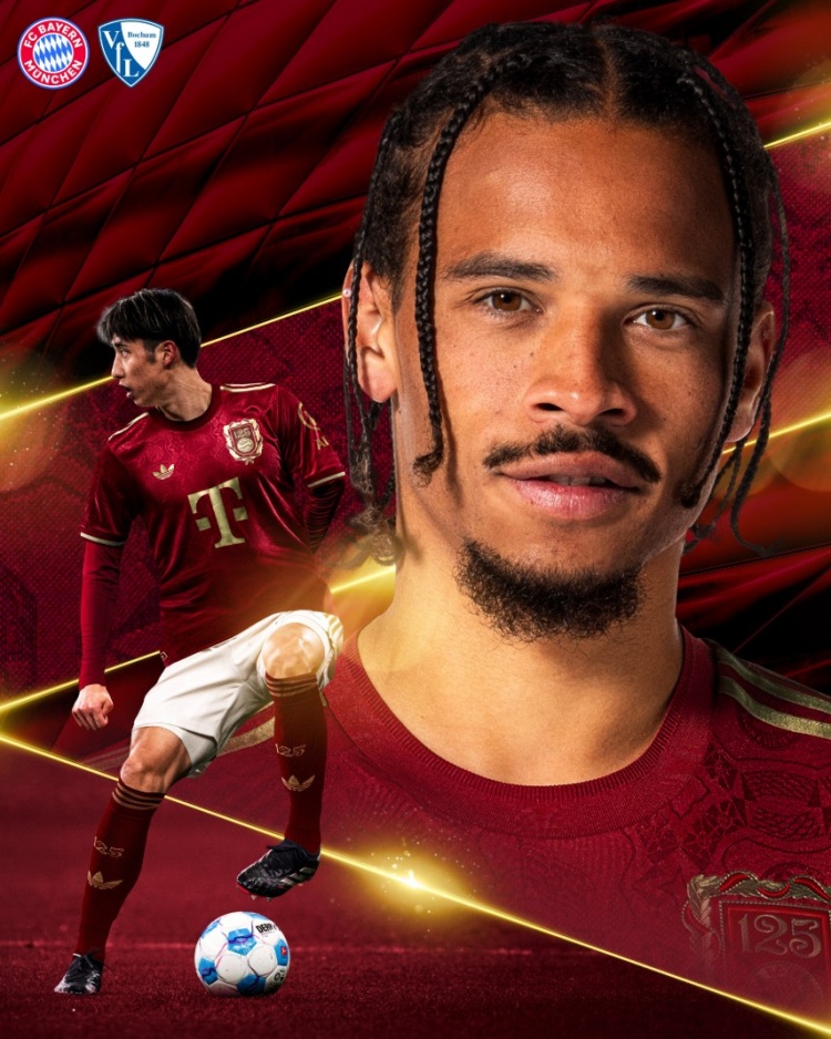 海報左上角為對陣雙方隊徽,出鏡球員為薩內(nèi)和伊藤洋輝。目前,拜仁24戰(zhàn)積61分,以8分優(yōu)勢領(lǐng)跑積分榜;波鴻24戰(zhàn)積17分,排名第16位。