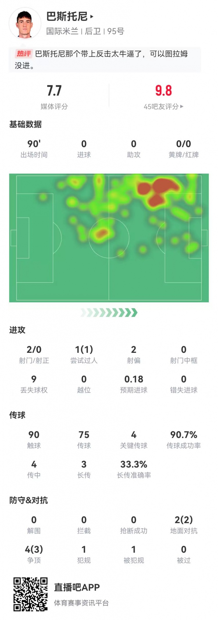 3月9日訊 國(guó)米在本輪意甲3-2逆轉(zhuǎn)蒙扎,巴斯托尼本場(chǎng)數(shù)據(jù)如下: