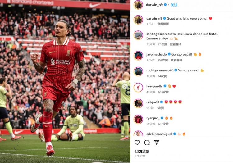 努涅斯也在賽后通過社媒曬出自己進球后的慶祝照,并配文:“很棒的勝利!讓我們繼續(xù)努力!”