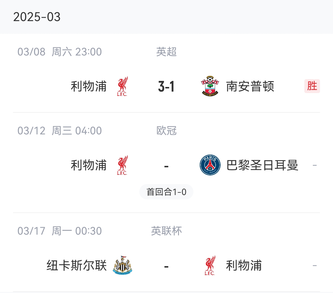 最終球隊(duì)3比1逆轉(zhuǎn)南安普頓,接下來球隊(duì)將在歐冠主場迎戰(zhàn)巴黎(首回合客場1-0),下周一凌晨,球隊(duì)將迎來與紐卡的英聯(lián)杯決賽,斯洛特將沖擊執(zhí)教球隊(duì)的首座獎(jiǎng)杯。