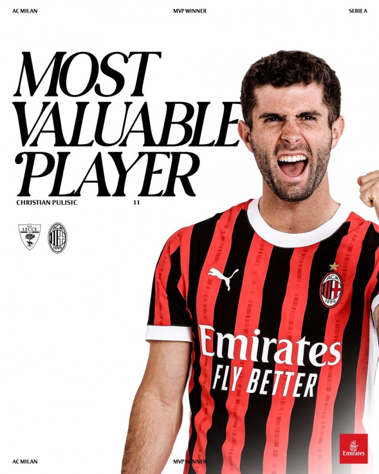 普利西奇本場打進兩球,據(jù)米蘭官方社媒消息,他也被評為此役隊內(nèi)最佳球員。