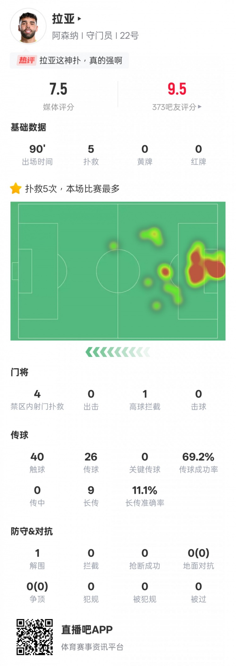 3月10日訊 英超第28輪,阿森納1-1曼聯(lián),拉亞首發(fā)出戰(zhàn),貢獻全場最多的5次撲救,其中有4次是撲救對手禁區(qū)內(nèi)的射門,他還有1次高球攔截,評分7.5。