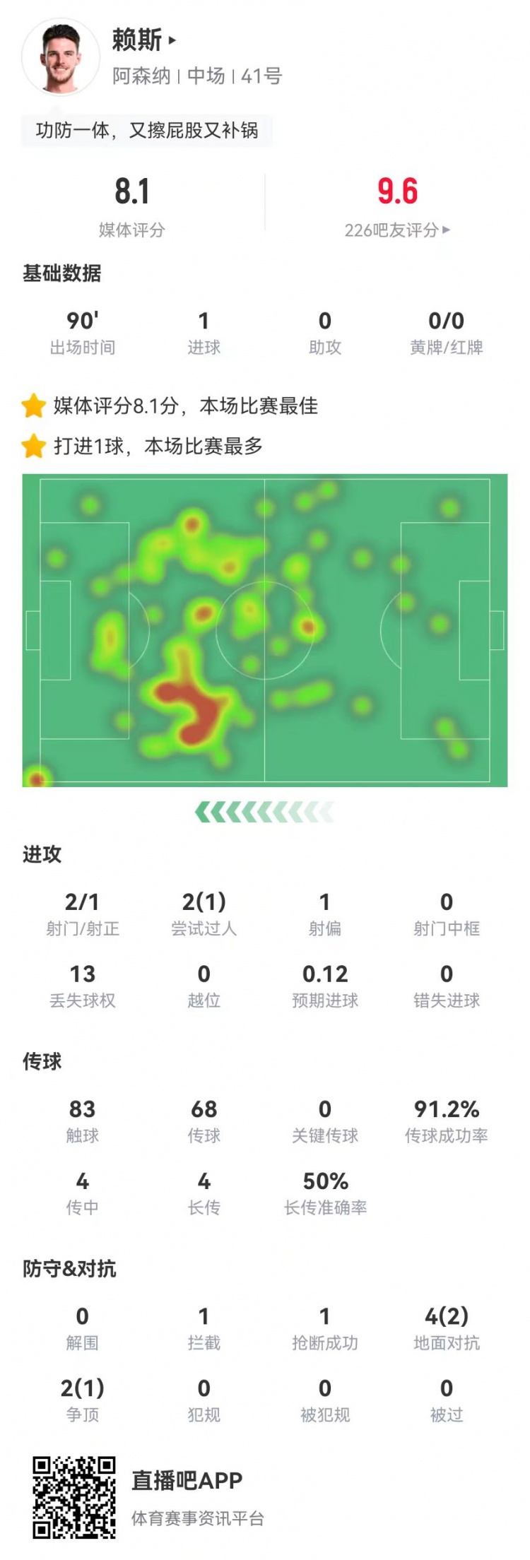 3月10日訊 阿森納在本輪英超客場(chǎng)1-1戰(zhàn)平曼聯(lián),賴(lài)斯本場(chǎng)數(shù)據(jù)如下: