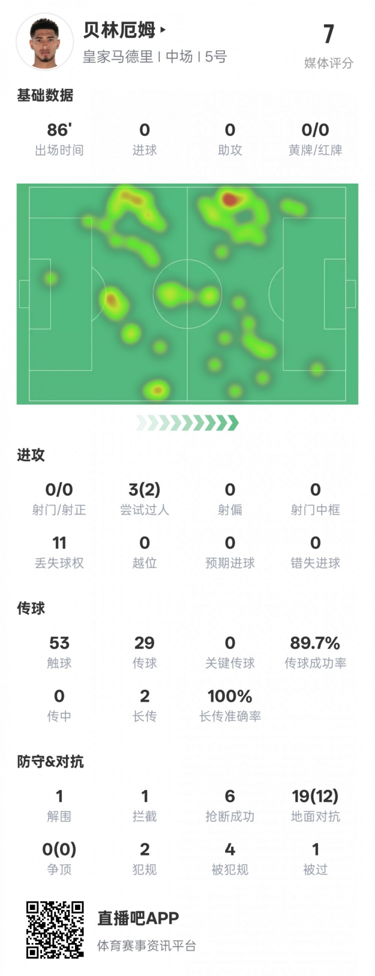 貝林厄姆本場(chǎng)比賽數(shù)據(jù)如下: