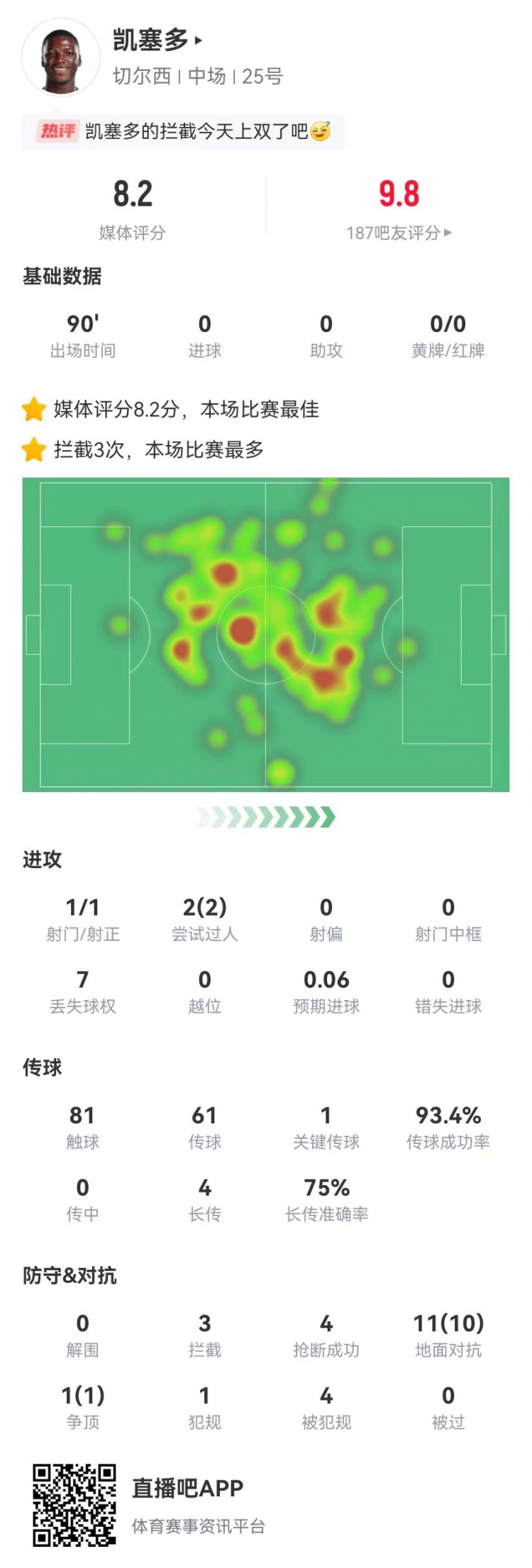 3月10日訊 切爾西在本輪英超1-0力克萊斯特城,凱塞多本場數(shù)據(jù)如下: