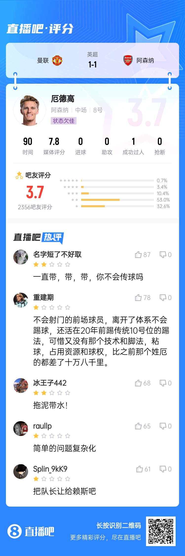 英超第28輪,阿森納客場1-1戰(zhàn)平曼聯(lián)。厄德高本場比賽首發(fā)踢滿全場,發(fā)揮糟糕。賽后國外眾多球迷在社媒展開了對厄德高的吐槽。 標(biāo)簽: 足球 英超 阿森納