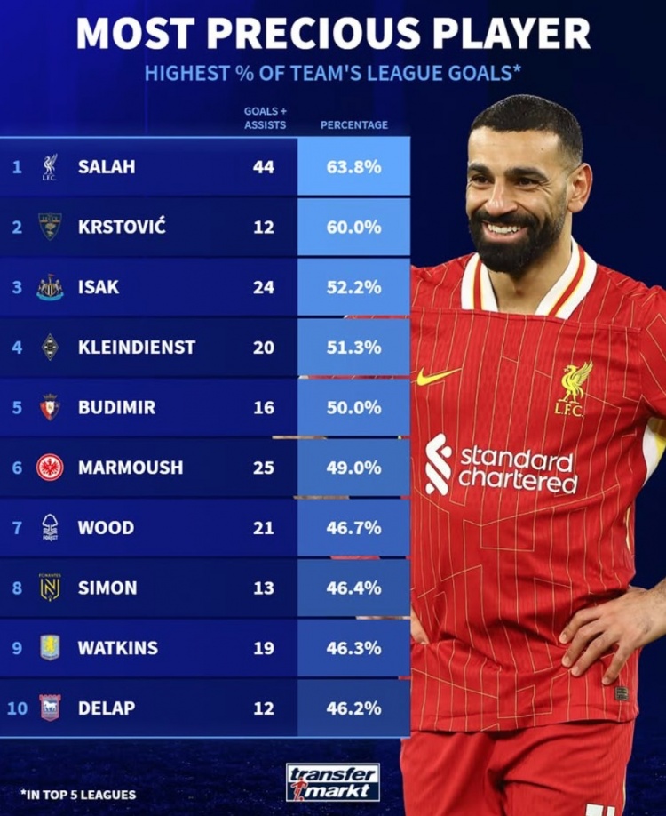 3月11日訊 《轉(zhuǎn)會(huì)市場(chǎng)》統(tǒng)計(jì)了本賽季五大聯(lián)賽直接參與進(jìn)球占全隊(duì)總進(jìn)球的比率情況,薩拉赫無(wú)懸念居首,已經(jīng)轉(zhuǎn)會(huì)曼城的馬爾穆什依然是法蘭克福隊(duì)內(nèi)最高。