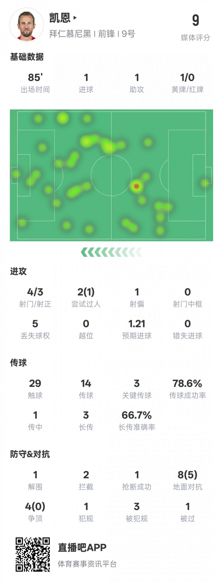凱恩本場比賽數(shù)據(jù)如下: