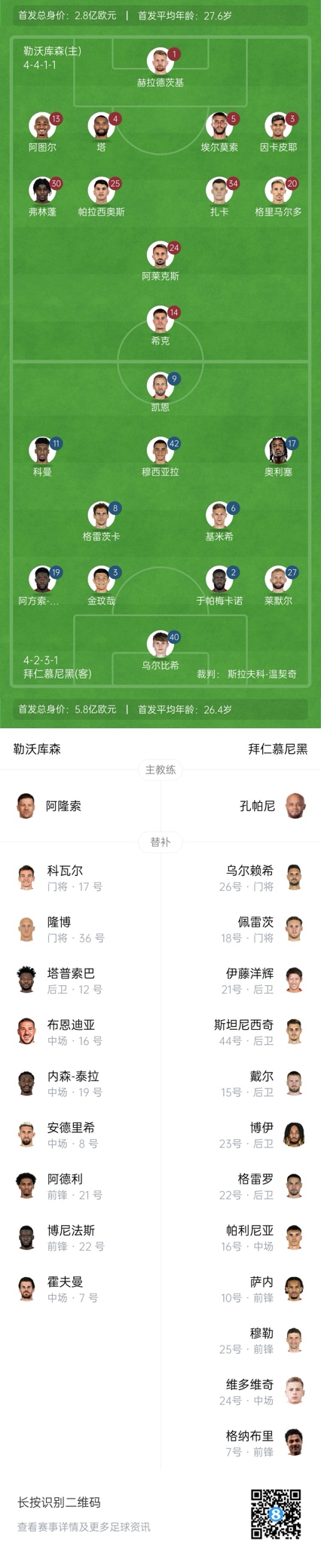 拜仁首發(fā):40-烏爾比希、3-金玟哉、2-于帕梅卡諾、19-戴維斯、27-萊默爾、8-格雷茨卡、6-基米希、11-科曼、42-穆西亞拉、17-奧利塞、9-凱恩