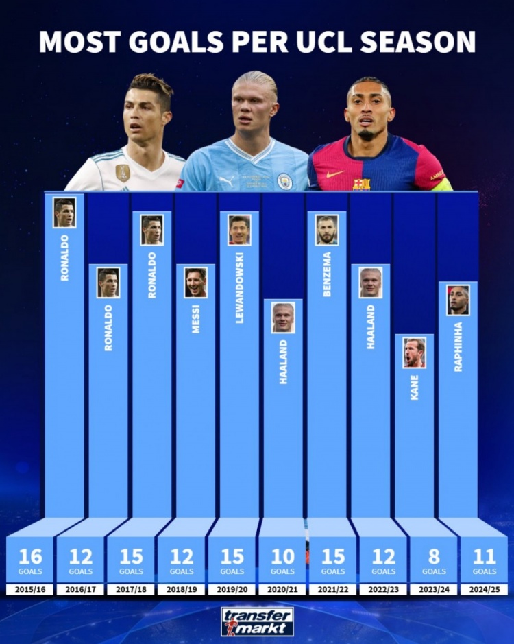 3月12日訊 本賽季拉菲尼亞狀態(tài)出色,目前在歐冠賽場(chǎng)以11粒進(jìn)球領(lǐng)跑射手榜。德轉(zhuǎn)也盤點(diǎn)了近10年歐冠單賽季最多進(jìn)球紀(jì)錄,具體如下: