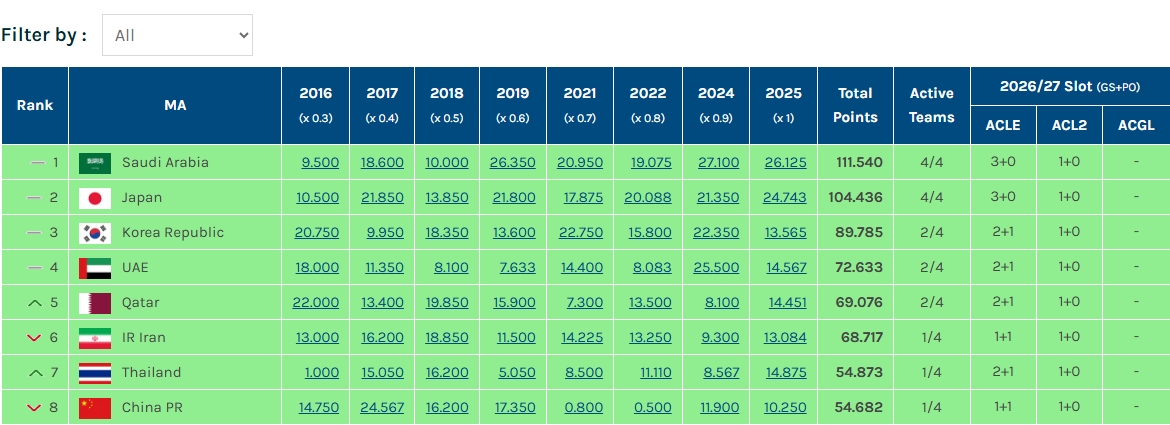 亞足聯(lián)俱樂部技術分東亞區(qū)第3,2+1個亞冠精英聯(lián)賽名額,1個亞冠2聯(lián)賽名額