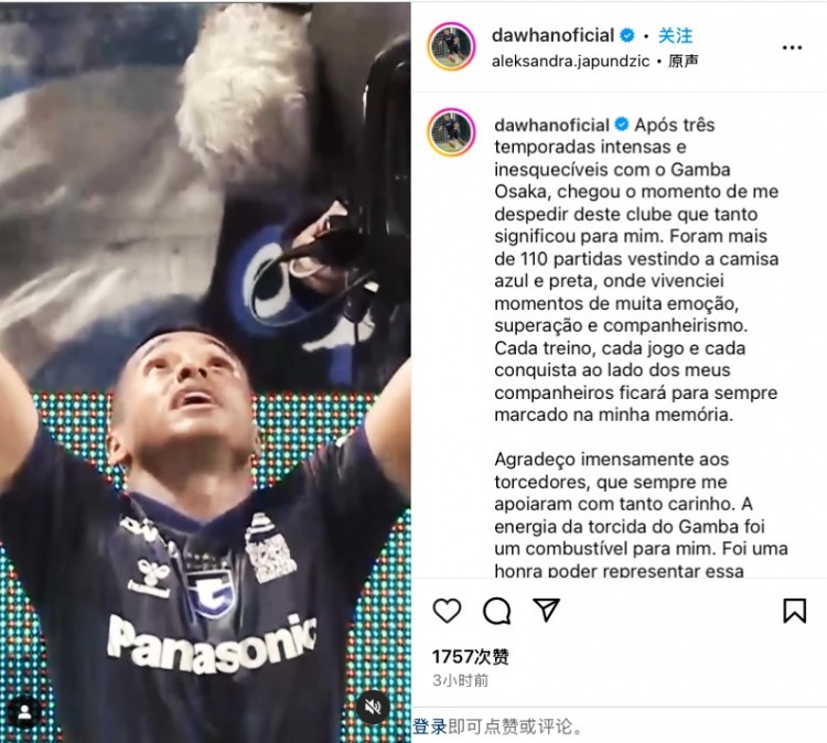 在轉(zhuǎn)會官宣后,達萬社媒發(fā)布視頻集錦,向大阪鋼巴球迷告別。他寫道: